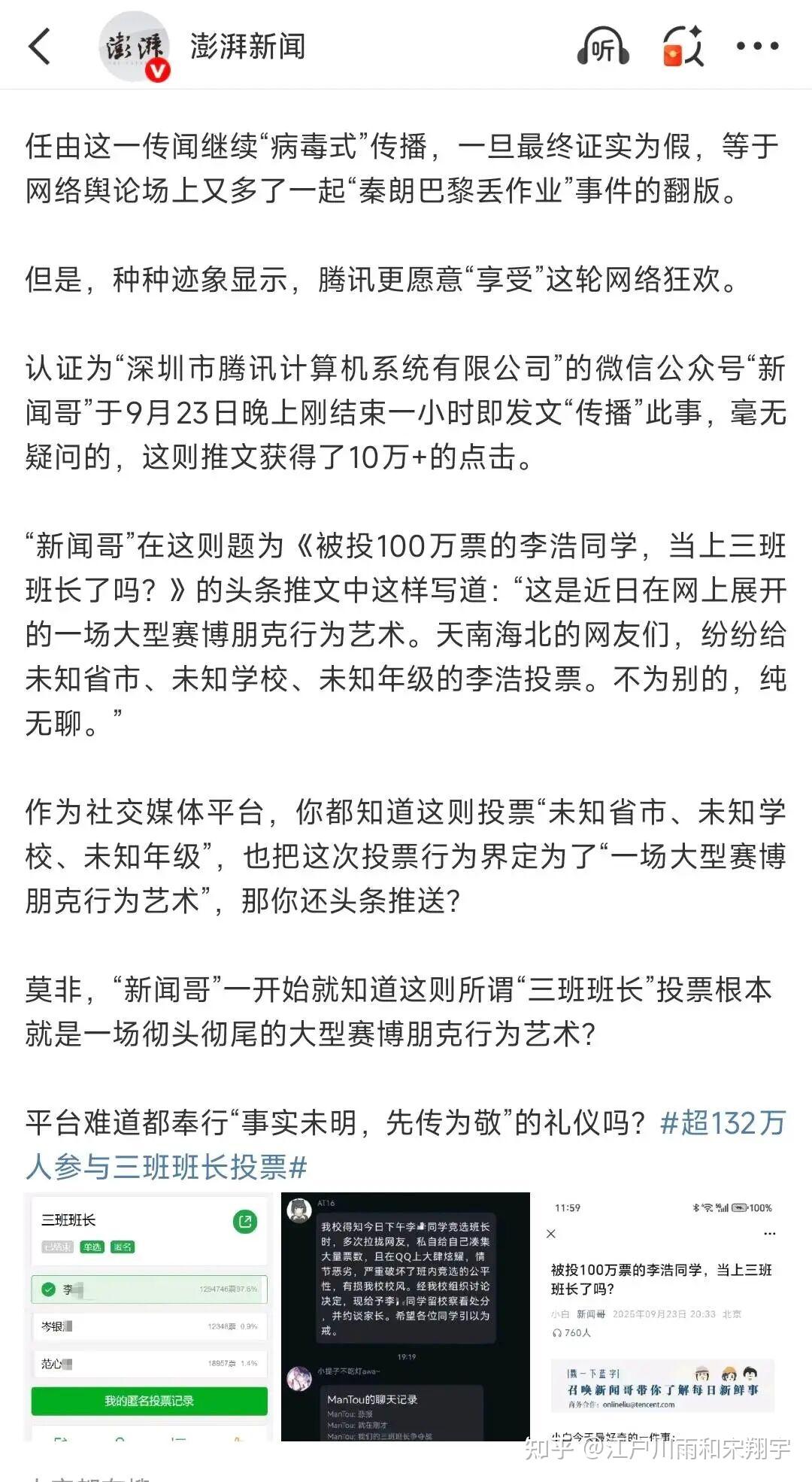 在这个事件当中的微信投票,它的一个荒谬之处就在于,它把一个人的领导力、责任心、组织能力等核心素养压缩成一个票数数据就给简单替代了。请问,这样一个简单的数字真的能够代表一个人的真正能力吗?更别说在缺乏监督机制时会必然引发的那种策略性投票了。