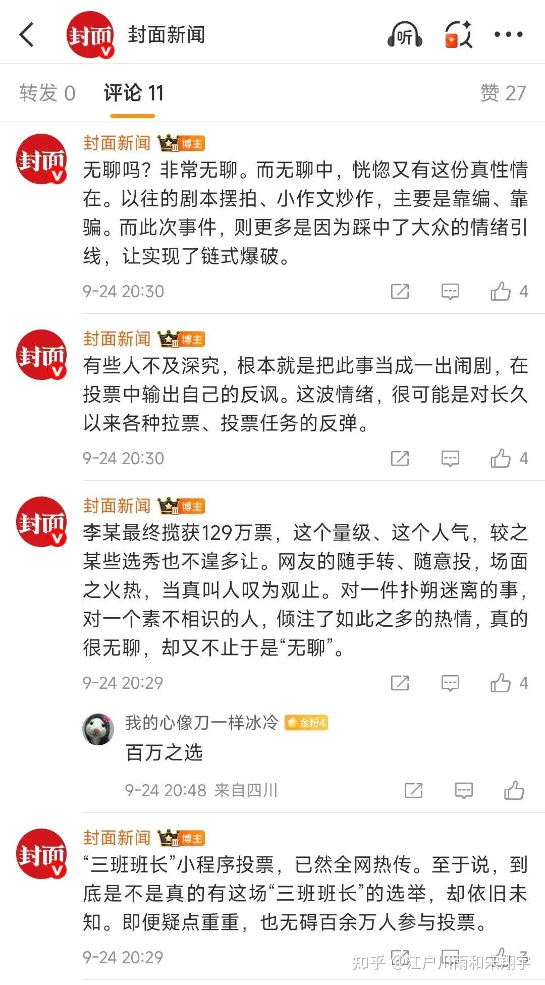 李同学以129万票当选班长!129万人支持是啥概念,如果是一千年前,那就是你一觉醒来,手下都跪在你门口,捧着一件黄衣服说:“大帅,天气冷了,要加衣服了!"所以这次事件当中的李同学也被网友戏称是“人民的班长”,是“大军阀”……